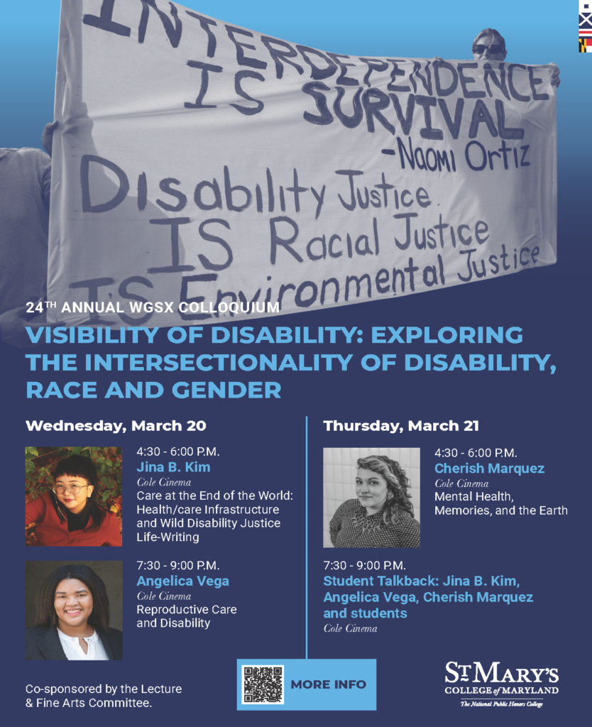 The 2024 Colloquium continues the program’s tradition of engaging with critical intellectual themes, this time focusing on disability visibility. This topic is not only timely given the current political landscape, but is of interest and relevance to the students, faculty and staff at SMCM. This topic, in part was inspired by student activism (i.e., Disability Speak Out event on March 3, 2023, where students with disabilities expressed their honest opinion and personal experiences regarding accessibility on campus, and at the same time, provided a place for students, faculty, staff, and other entities allies to listen). In September 2023, the National Institutes of Health designated people with disabilities as a population with health disparities. The “designation, new research program and update to NIH mission are actions to ensure inclusion of people with disabilities.” As we aim to build a more welcoming and inclusive campus, this is an urgent topic to address. It provides an ideal opportunity to model the intersection of academic study, social engagement, and social justice activism, which defines the WGSX Program curriculum.