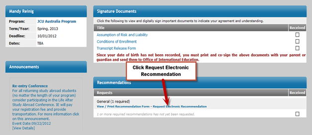 First, you will need to click on the Request Electronic Recommendation link on your application.