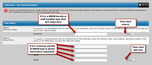 Once you click on this you will be able to search for a SMCM faculty or staff member or manual request a recommendation from someone outside of SMCM.
