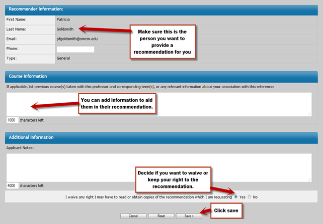 Either of the search or the manual entry option will take you to the following screen where you should make sure that you are requesting your recommendation from the correct person (you are only allowed a set number of recommendations per application and can’t change the recommender once it has been sent). You can also enter information that will aid them in providing your recommendation. Once you click Save this will send the SMCM faculty or staff member a link to the recommendation form and their name will appear under recommendations on your application.